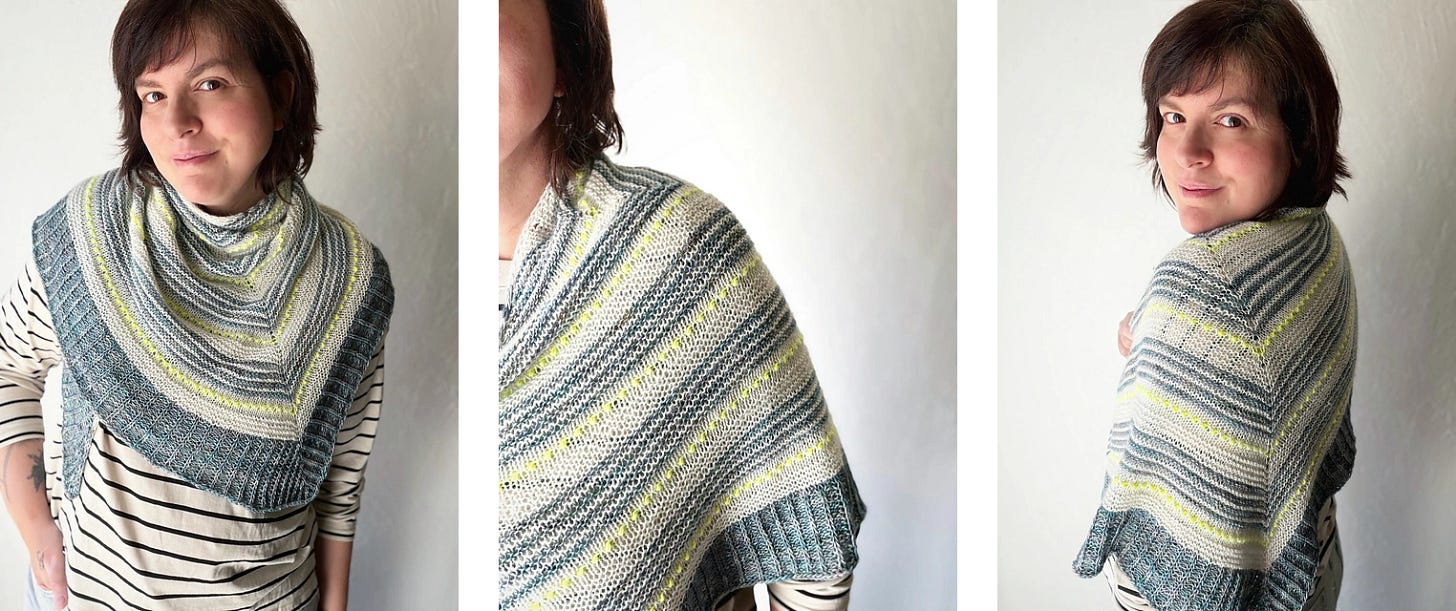 A brand new release from Nadia Crétin-Léchenne, and a real stunner! The Miramare shawl is worked seamlessly from the top down, with garter stripes accented by rows of dainty contrasting bobble stitch.