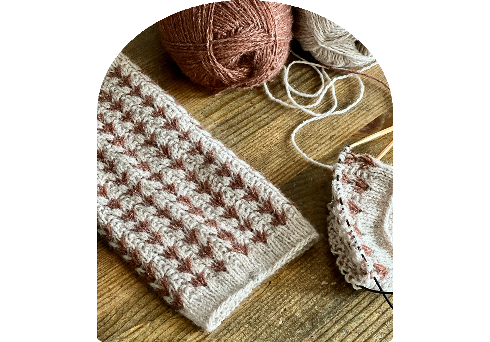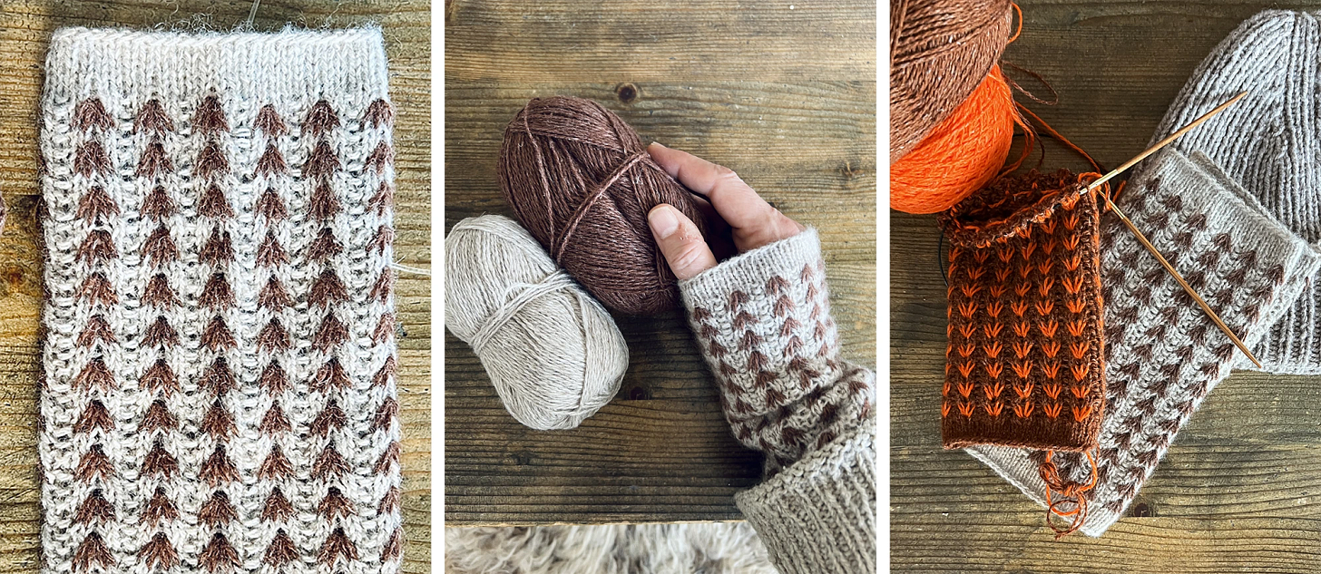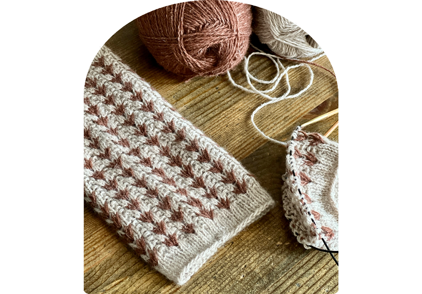 These wrist warmers are a lovely way to practice knitting two colour dip stitch - only one colour is worked at a time in a round, so there’s no potential headaches with yarn management to contend with. There’s only one contrast colour round per pattern repeat, too, making it easier to keep track and fall into a rhythm.